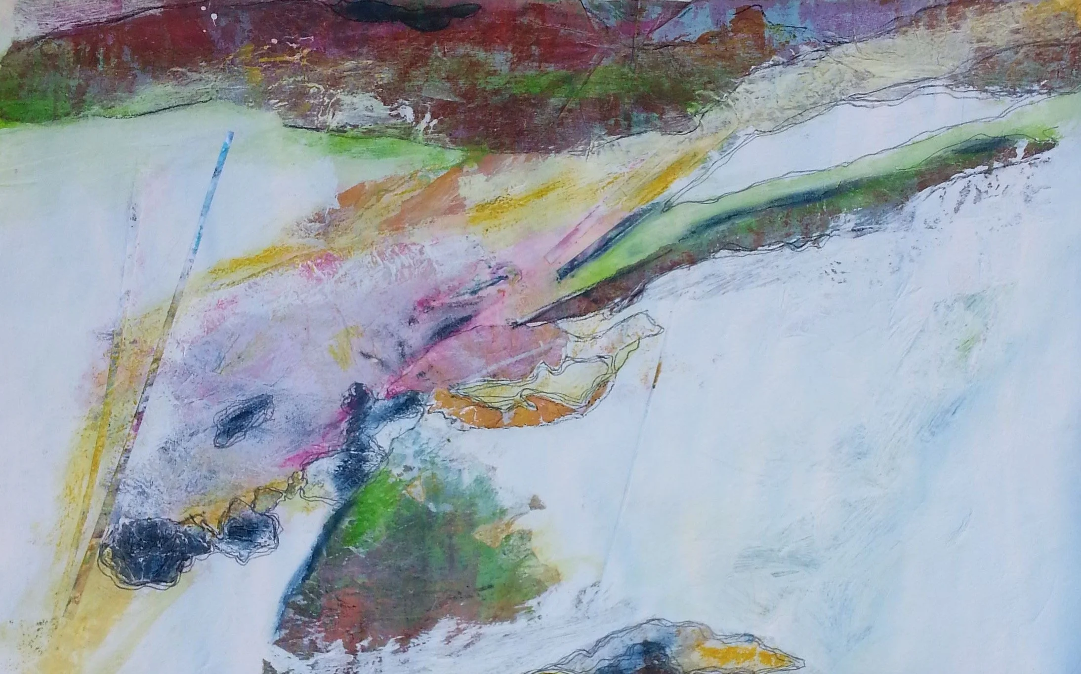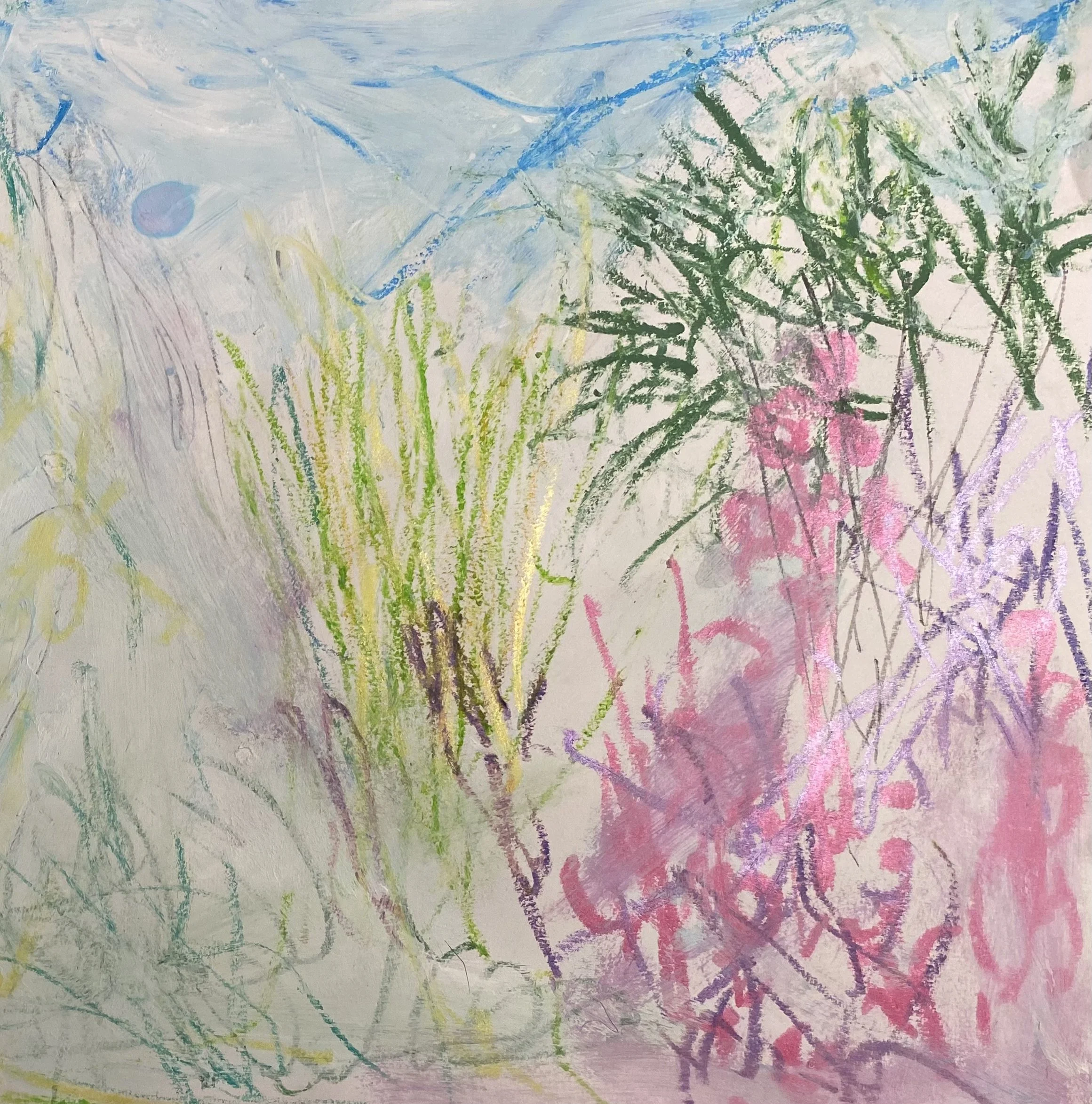 Michelle’s art process explores the relationship between place, memory and emotion, building surfaces through layering, erasure, and repetition. Her landscapes often feature flattened perspective or aerial viewpoints, offering abstracted impressions rather than literal scenes. Colour and composition are intuitive, shaped by time spent in the landscape and the emotional residue it leaves behind. Whether drawn from a specific location or a remembered sense of place, her work invites quiet attention and personal interpretation.