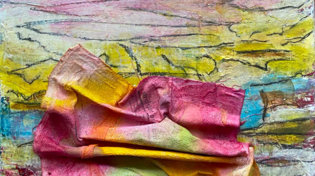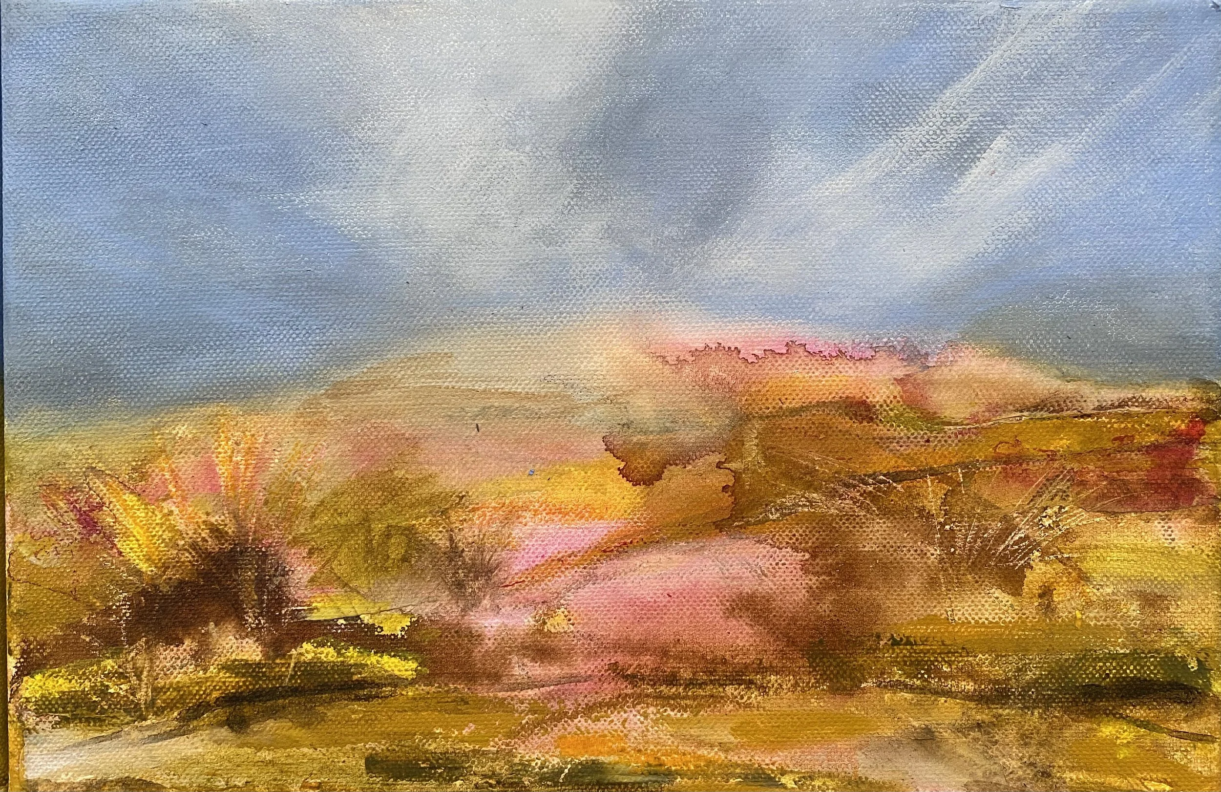 Working primarily with acrylic, ink, and pastel, her process is slow and layered, allowing images to surface gradually through mark-making, erasure, and repetition. Her compositions often sit on the edge of abstraction, where horizon lines blur and the boundary between place and feeling becomes porous.